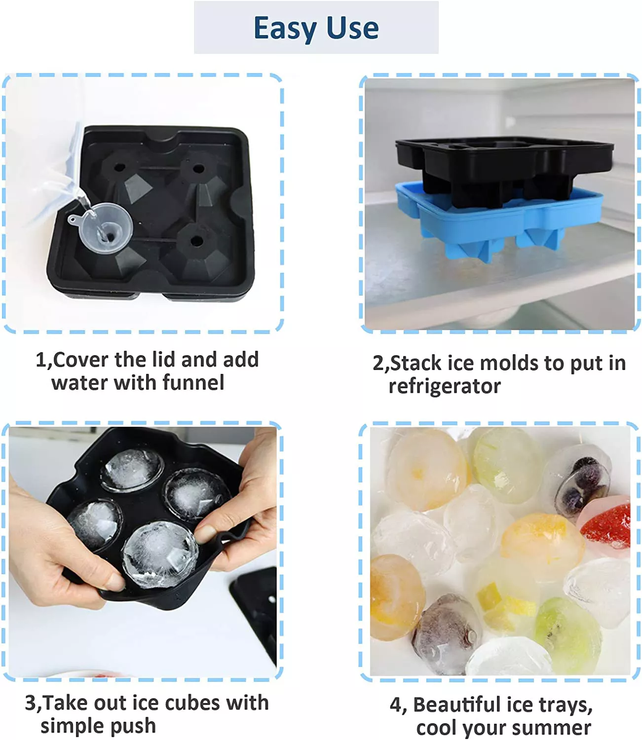 Diamond Ice Cube Molds Reusable Silicone Flexible 4-Ice Trays Maker with Lid for Chilling Whiskey Cocktails