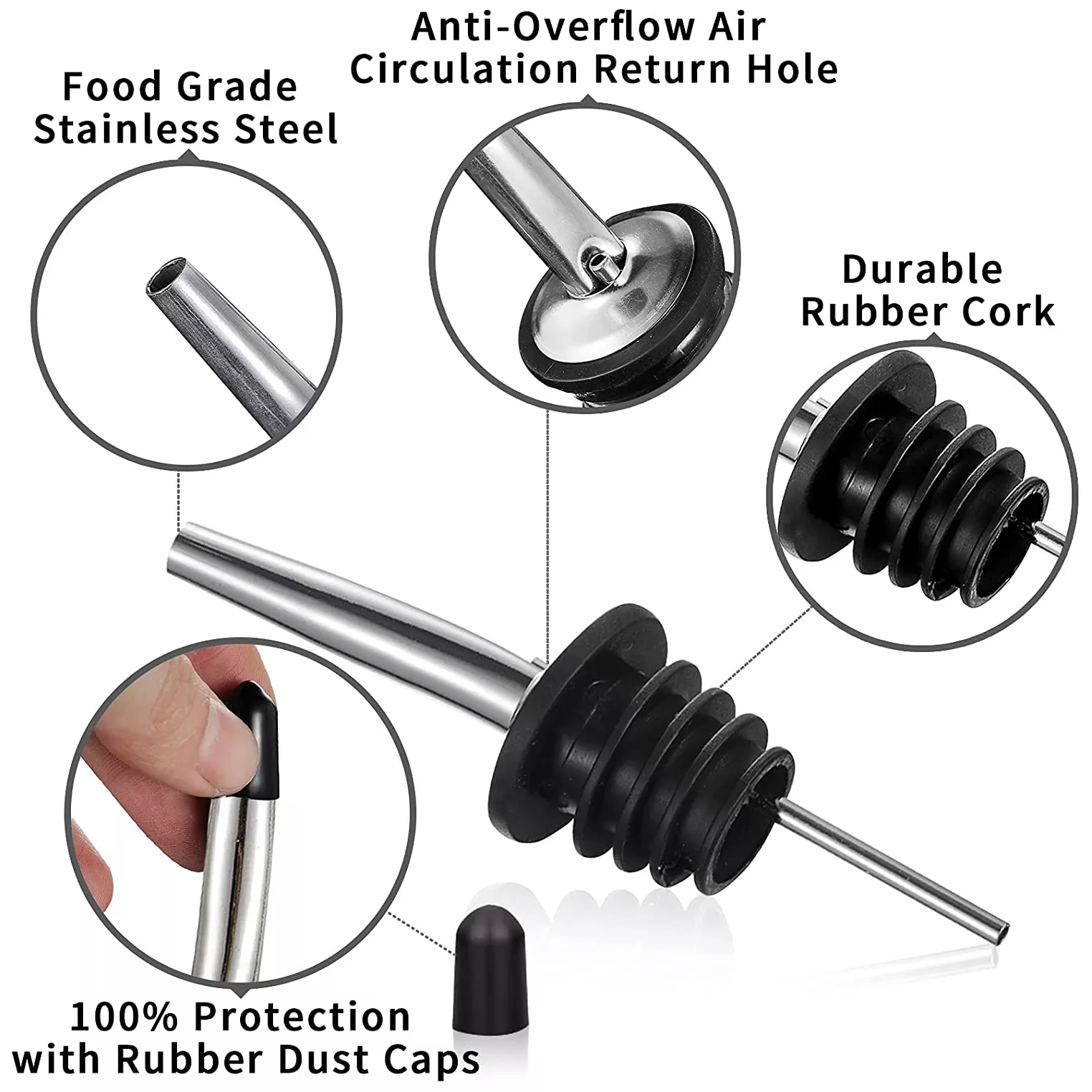 Stainless Steel Classic Bottle Pourers Tapered Spout – Liquor Pourers with Rubber Dust Caps